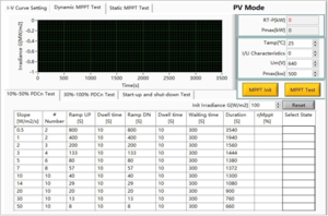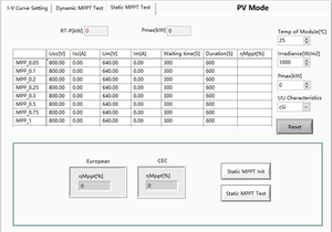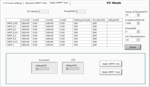 With PV option, ESD series power supplies can be used to simulate IV curves of various solar panels, under various temperature and irradiance condition, and conduct static and dynamic MPPT tests according to EN 50530:2010. MPP update rate: 200Hz. Irradiance levels: 0 ~ 1500 W/m². Temperature: -10 ~ +100°C. Temperature coefficient: +1% ~ -1%/°C.