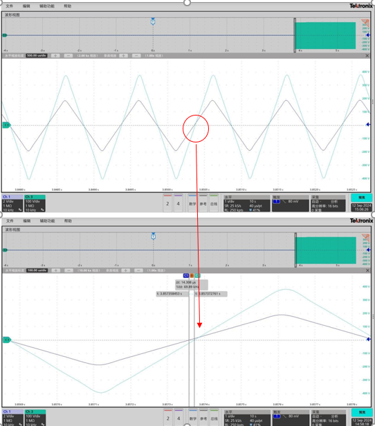 测试采用Rigol DG821信号发生器,输出小信号至KGS的模拟量输入接口,控制A相输出,同时采用Tektronix MSO44测量信号发生器和KGS电源A相的输出。信号发生器输出设置为三角波,频率1KHz;KGS设置为模拟量控制,CV输出。测试波形如图3所示。测试结果显示,KGS的输出延时<20µs。