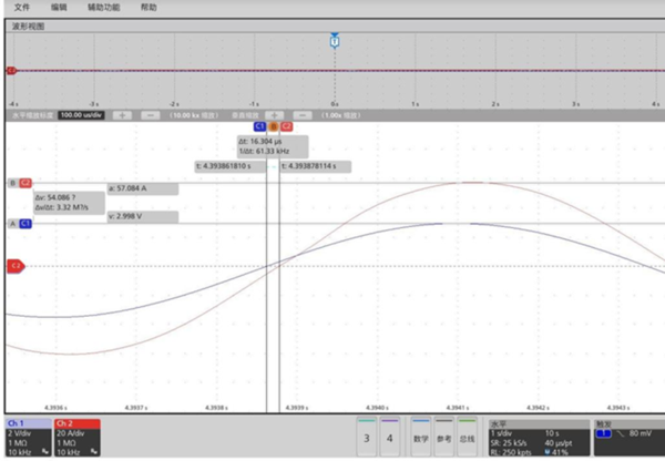 KGS系列用作功率放大器时,也支持恒流模式。以下测试,采用图2同样的连接,设置信号发生器输出正弦波,频率1KHz,通过KGS的模拟量接口控制A相输出,KGS此时设置为恒流输出。使用示波器同步测量信号发生器的输出波形和KGS电源A相的输出波形,测试波形如图4所示,测试结果显示KGS的输出响应时间同样小于20µs。