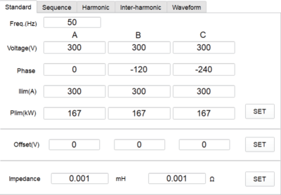 带有-IMP选项的ESA系列电源可以模拟线路输出阻抗(RL)。最大可模拟20%的额定短租阻抗。用户可以在图形界面中设置 电阻值和电抗值。设置范围:Rmax=0.2Urated/Irated;Lmax:Rmax/314。