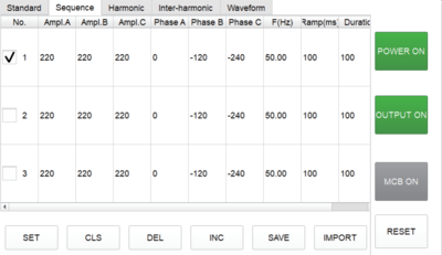 - 序列模式输出设置:可对电源的输出相电压、角度、频率、起始/关断相角、维持时间及切换时间等参数进行更改