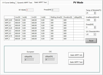 BSL系列提供光伏模拟软件,可用于模拟各种太阳能电池板在不同温度和辐照度条件下的 IV 曲线,并在EN 505 30: 2010标准下进行静态和动态MPPT特性测试。MPP更新速率为200Hz。辐照度水平为0~1500W/m²,温度值 为-10~ + 100°C,温度系数为+1%~-1%/°C。
