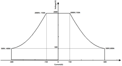 如图所示,BSL系列BSL 300-2000-600的输出 I/V曲线(输 出范围:300KW,5~2000V,±600A)。